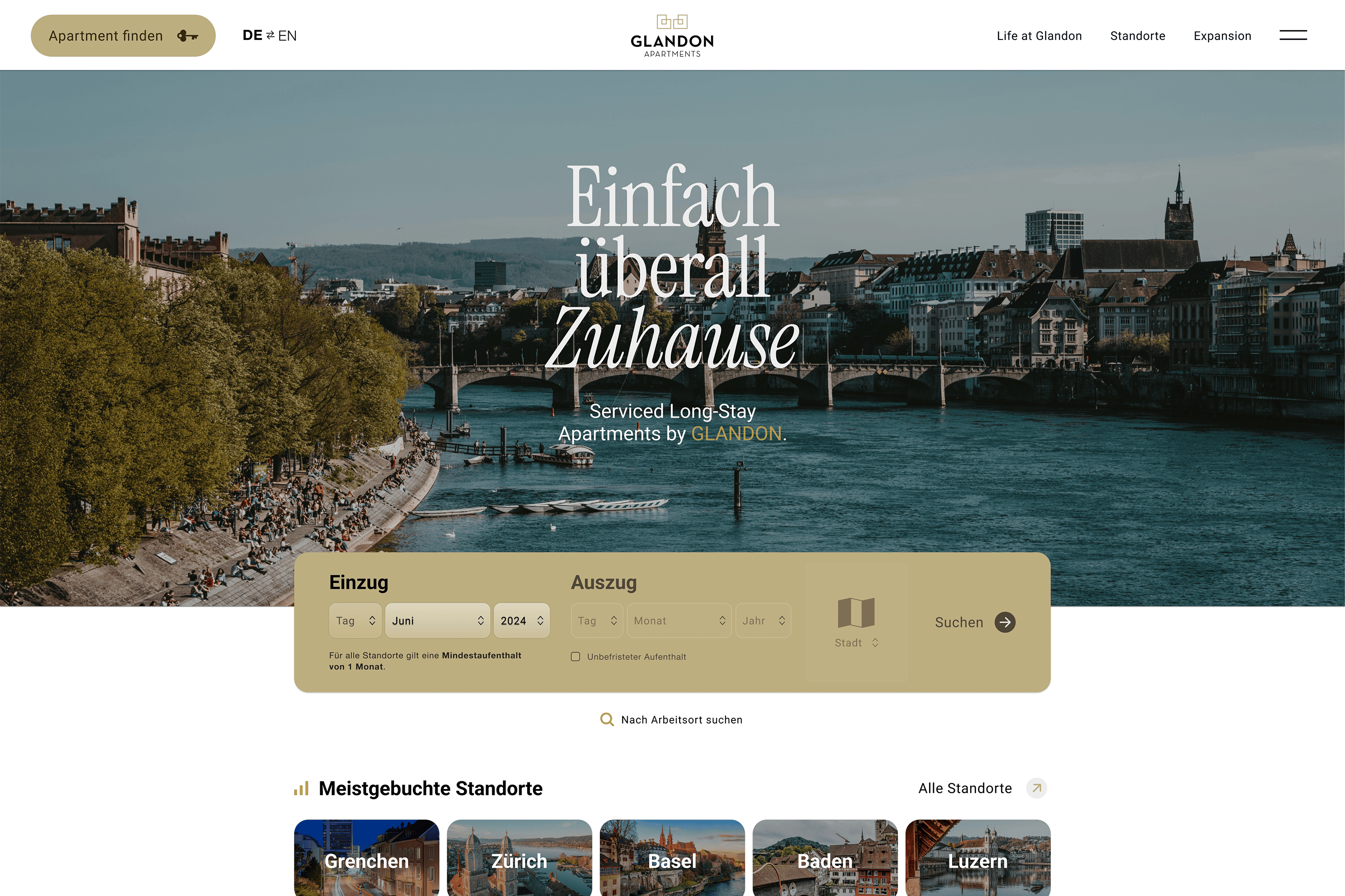 GLANDON bietet möblierte Apartments in der Schweiz an – für Geschäftsreisende genauso wie für Menschen, die vorübergehend ein Zuhause brauchen. Zum Beispiel nach einer Renovierung, während eines beruflichen Projekts oder im Ruhestand. Die Apartments sind hochwertig ausgestattet, zentral gelegen und stehen für Service, Sauberkeit und Verlässlichkeit.