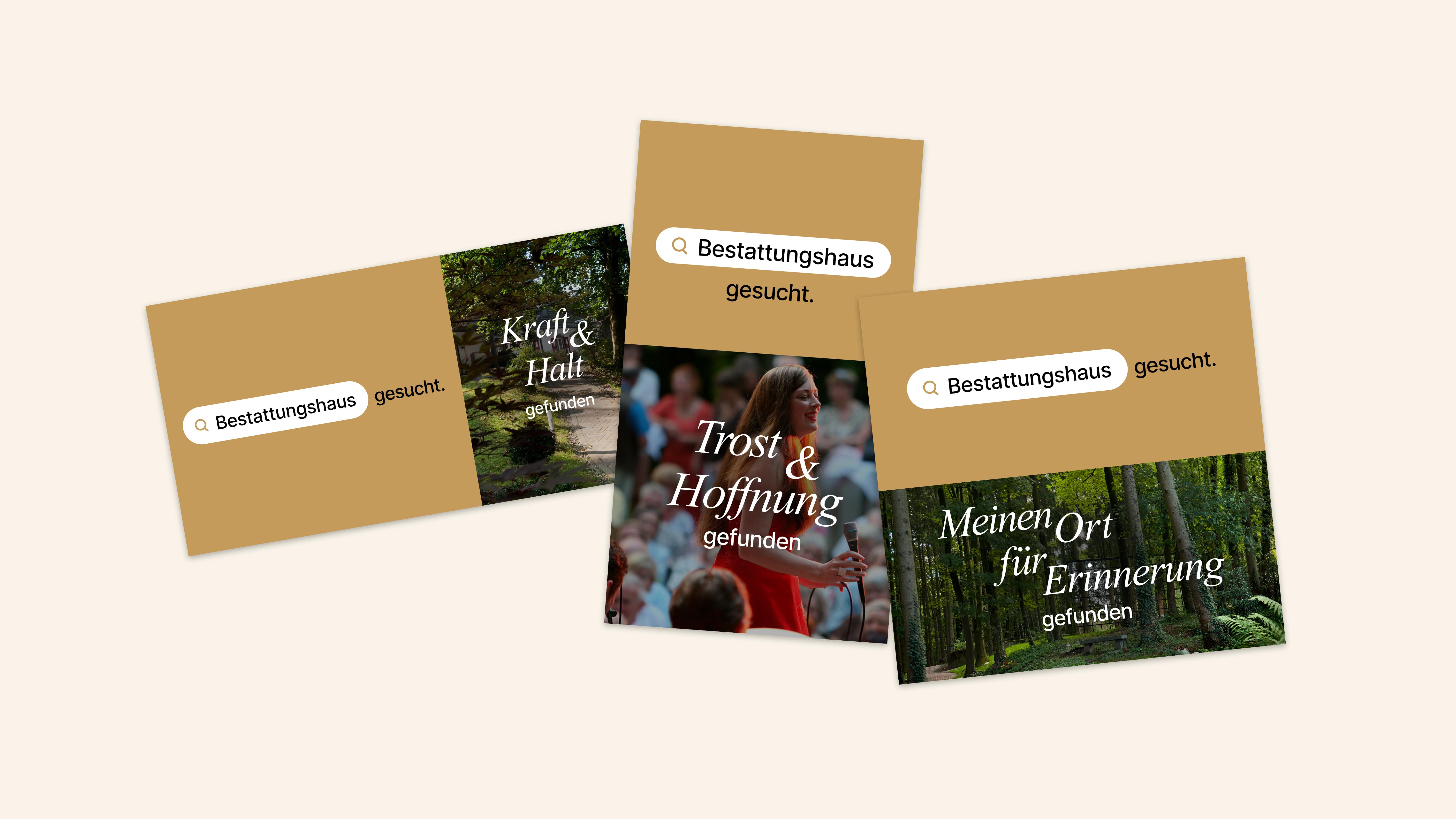 Die Visuals haben diese Idee voll und ganz umgesetzt. Ein Suchfeld mit dem Wort „Bestattungshaus“ führte in jeder Anzeige zu Aussagen wie „Trauerbegleiter gefunden“, „Eine Oase für Trauernde“ oder „Eine Heimat für meine Trauer“. Wer nach einem Bestatter suchte, entdeckte bei Pütz-Roth einen Ort, der viel mehr bietet – einen Ort der Begegnung, Fürsorge und Offenheit.